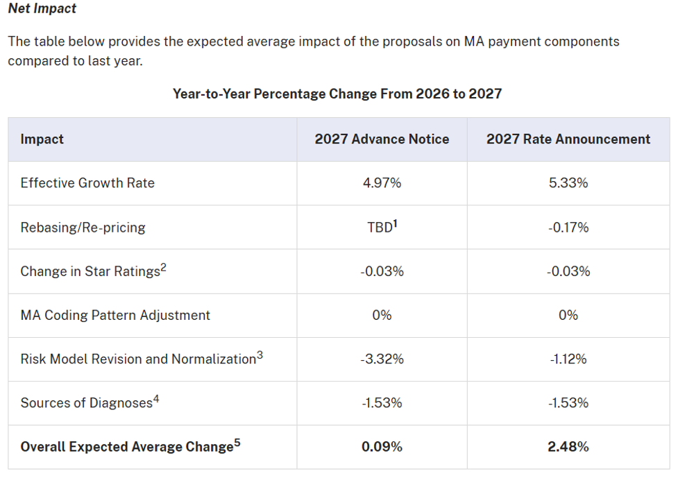 Compared to the Advance Notice, CMS has taken a more measured approach…resulting in an expected 2.48% increase in MA payments. This creates a more predictable financial environment for 2027 planning.